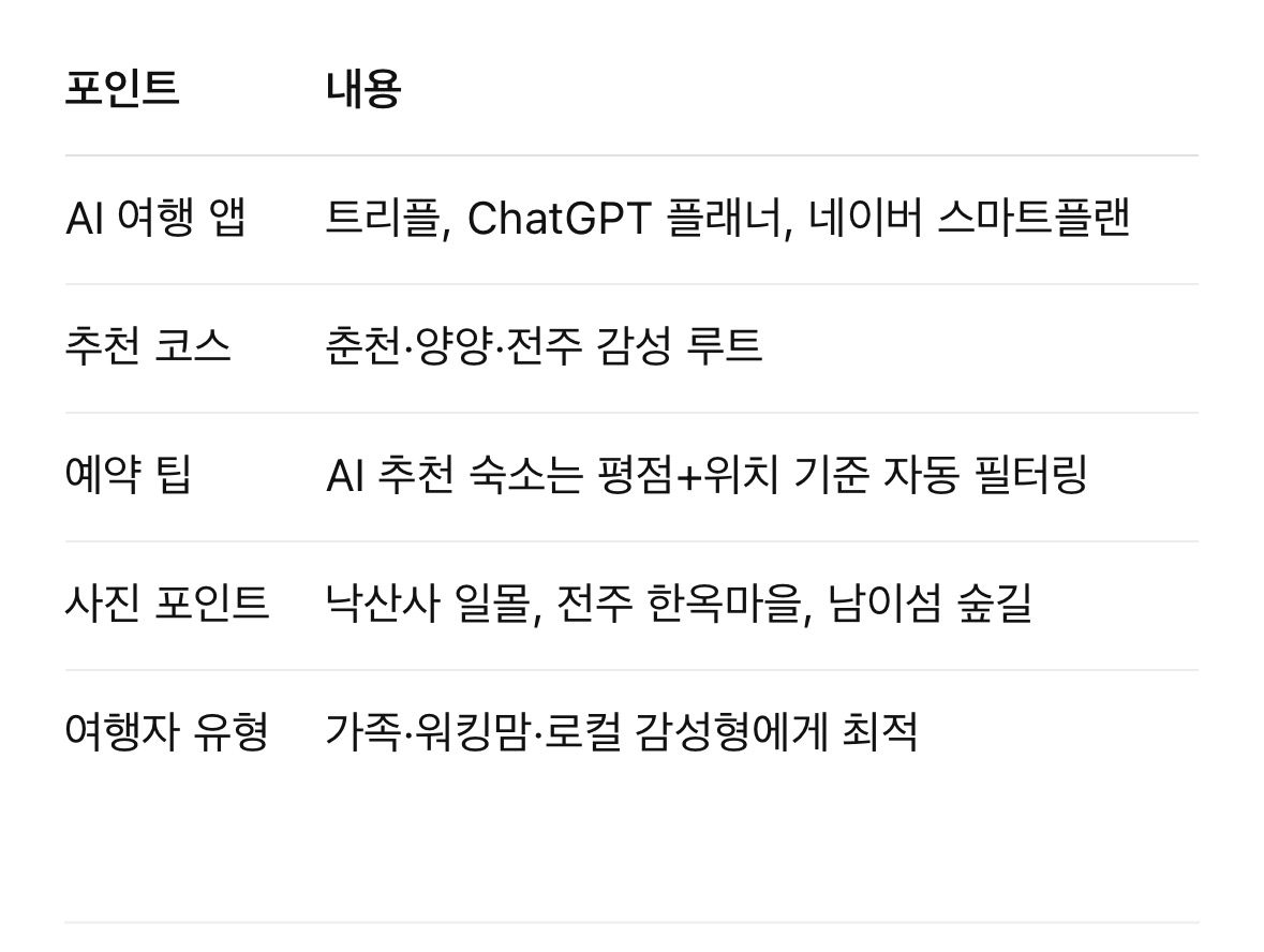 #AI여행 #국내여행추천 #트리플앱 #ChatGPT여행플래너 #네이버플랜 #스마트여행 #양양여행 #전주한옥마을 #강원도드라이브 #힐링여행코스