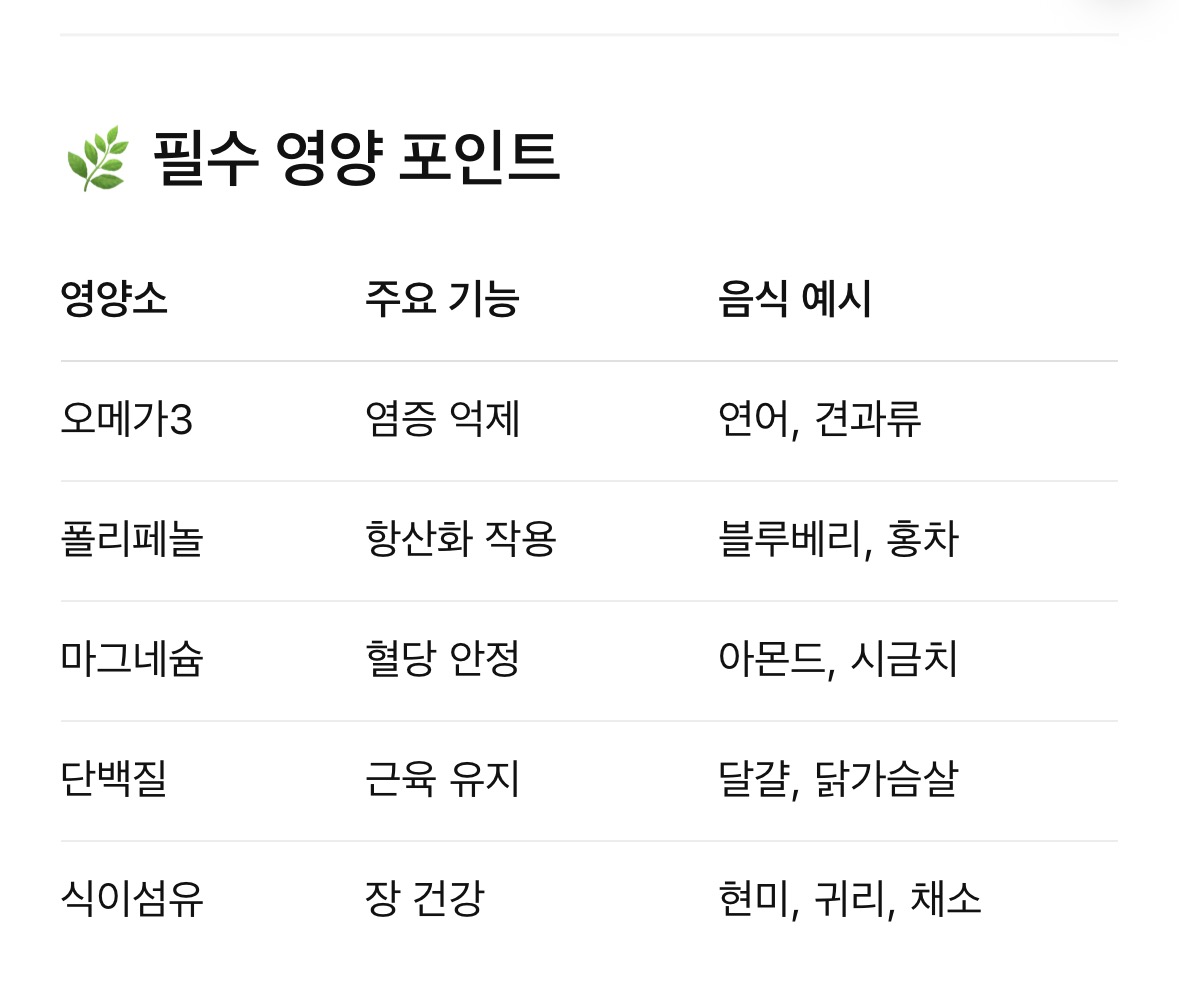 즉, 지방은 줄이고, 염증은 잡고, 혈당은 안정시키는 방식이에요.