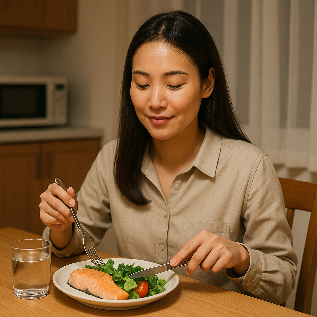 ‘저속노화 다이어트’의 기본은 **“무엇을 먹느냐”보다 “어떻게 먹느냐”**예요.