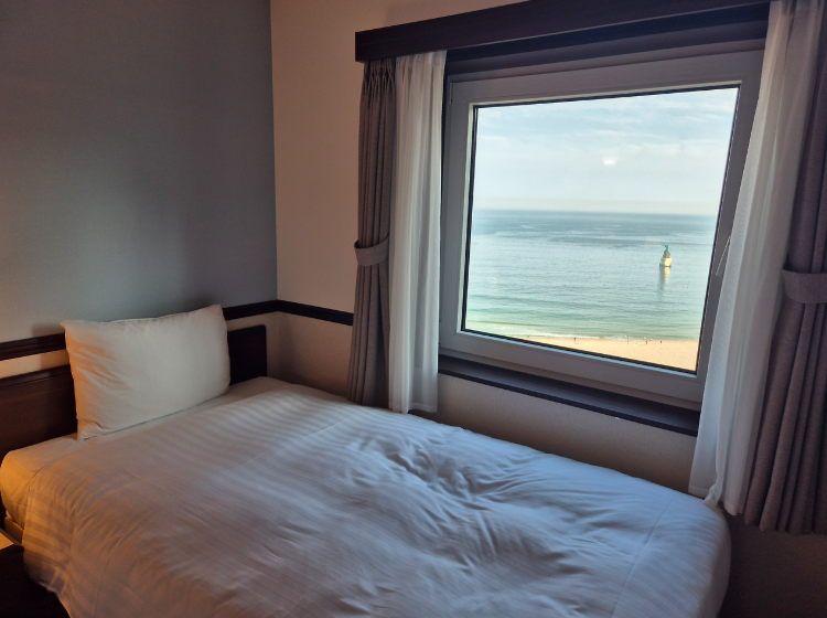 체크인하고 커튼을 걷는 순간, 창밖으로 펼쳐지는 바다… 남편과 동시에 “와~” 소리가 나왔습니다.